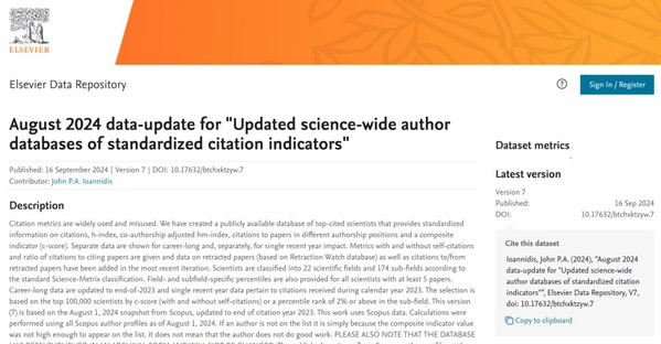 2024年9月16日,斯坦福大学与Elsevier共同宣布更新了标准引文指标的全科学作者数据库,并发布了第七版2024全球前2%顶尖科学家榜单(World's Top 2% Scientists)。该榜单基于Scopus数据库的引用数据进行深入分析,利用包括被引数(区分自引和他引)、H指数、HM因子等在内的六种综合指标(composite score,C-score),从全球近700万名科学家中遴选出排名前2%的科学家。