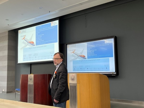 Coombs 教授在报告厅F104受邀作主题报告“Engineering Application of Superconductivity”,沈博洋教授主持,共有超过100名老师和同学参与。报告伊始,Coombs教授以清晰直观的图片引入超导在交通、电气、能源、医学、航空航天等领域的应用。并从超导材料的发展角度,划分了低温超导与高温超导。随着高温超导的出现,让制冷从液氦环境变为液氮环境,大大节约了成本,更有利于超导工程应用的全面发展。